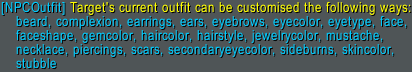 Toutes les options de personnalisation du menu de création des personnages peuvent être appliquées à votre PNJ-forgé et portent un ID disponible dans ce même menu. D'ailleurs, le décalage des ID rencontré dans l'extension précédente a été corrigé. Désormais, si vous sélectionnez la peau numéro 5, l'ID sera bien 5. Chaque race et sexe a des options de personnalisation uniques. Pour connaître quelles options sont disponibles pour le modèle que vous avez sélectionné, entrez la commande suivante puis référez vous à l'exemple pour mieux comprendre :